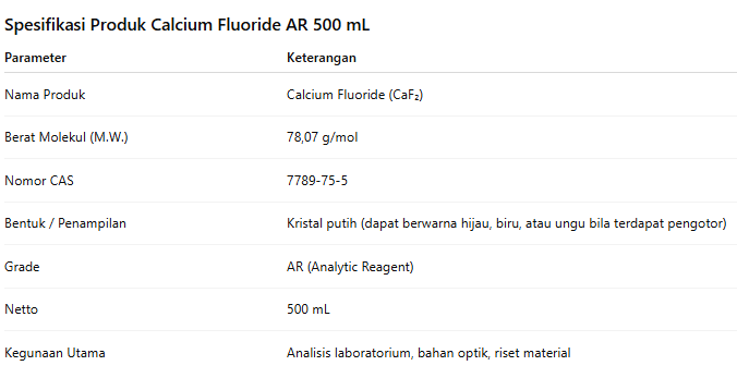 Calcium Fluoride (CaF₂) AR 500 mL adalah pereaksi analitik berkualitas tinggi dengan kemurnian yang sesuai untuk aplikasi laboratorium, industri optik, hingga penelitian material. Dengan spesifikasi lengkap (M.W. 78,07 g/mol; CAS 7789-75-5) dan kemasan praktis 500 mL, produk ini menjadi pilihan tepat untuk memenuhi kebutuhan analisis dan riset yang memerlukan senyawa fluorida berkualitas tinggi.