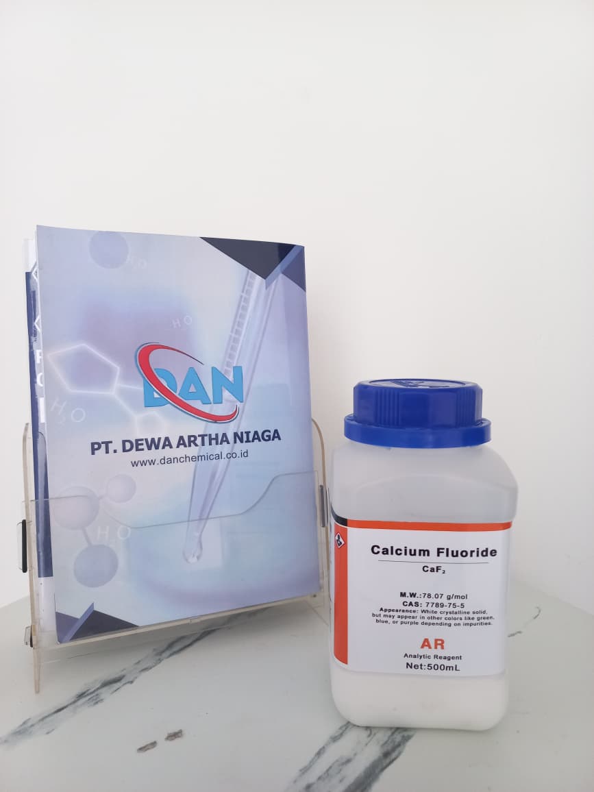 Calcium Fluoride (CaF₂) adalah senyawa anorganik berbentuk padatan kristalin putih yang secara alami dikenal sebagai fluorit. Senyawa ini memiliki rumus kimia CaF₂ dengan berat molekul 78,07 g/mol dan CAS Number 7789-75-5. Produk ini tergolong Analytic Reagent (AR Grade) yang sesuai untuk berbagai aplikasi analisis laboratorium dan riset.