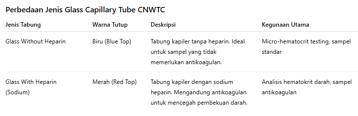 • Glass Without Heparin (Blue Top): tabung kapiler tanpa heparin, cocok untuk sampel yang tidak memerlukan antikoagulan.