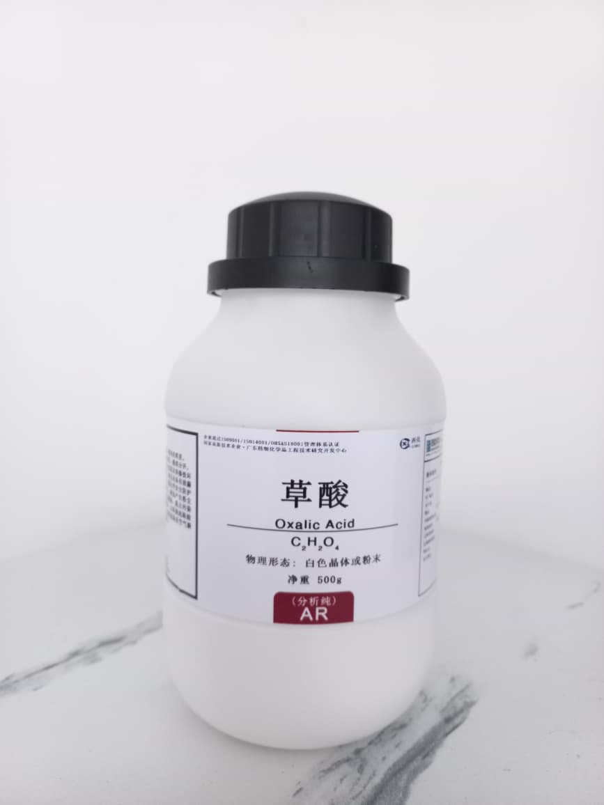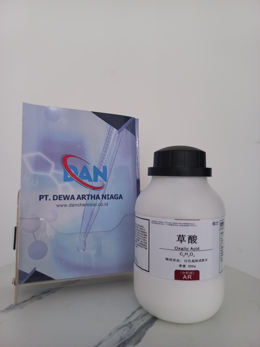 Produk ini memiliki grade AR (Analytical Reagent), yang berarti kemurniannya sangat tinggi dan sesuai untuk kebutuhan analisis laboratorium maupun riset. Pada label, tertulis dalam bahasa Mandarin “草酸” yang berarti Asam Oksalat.