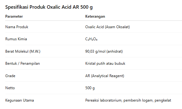 Oxalic Acid (C₂H₂O₄) AR Grade 500 g adalah senyawa asam organik serbaguna dengan kemurnian tinggi untuk berbagai aplikasi laboratorium dan industri. Dengan spesifikasi lengkap (AR Grade, kristal putih, netto 500 g), produk ini menjadi pilihan tepat bagi pengguna yang membutuhkan asam oksalat berkualitas untuk analisis maupun produksi.