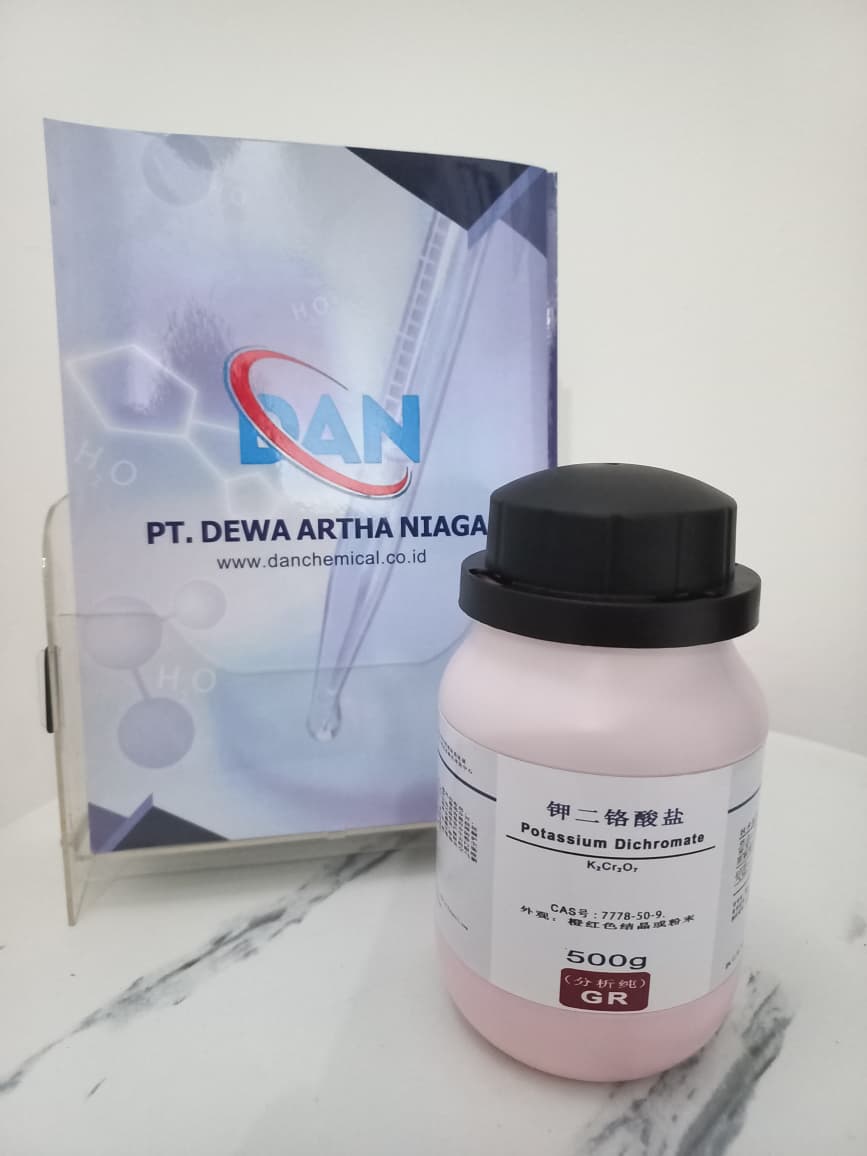 Potassium Dichromate (K₂Cr₂O₇) adalah senyawa anorganik berbentuk kristal atau bubuk berwarna oranye kemerahan yang dikenal luas sebagai oksidator kuat di laboratorium maupun industri. Senyawa ini memiliki CAS Number 7778-50-9 dan merupakan bahan kimia berbahaya yang bersifat toksik serta karsinogenik sehingga perlu penanganan hati-hati.