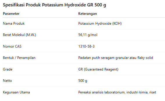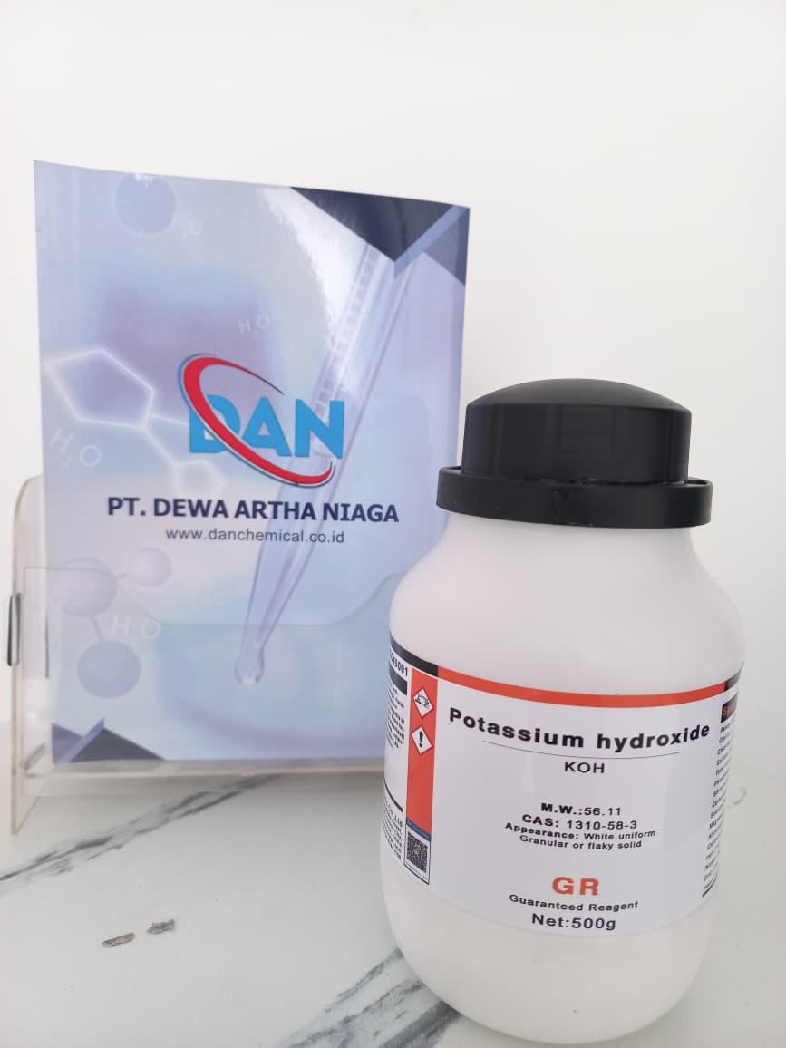 Potassium Hydroxide (KOH) adalah senyawa anorganik bersifat basa kuat yang umum dikenal sebagai potash kaustik. Senyawa ini memiliki rumus kimia KOH dengan berat molekul 56,11 g/mol dan CAS Number 1310-58-3. Produk ini merupakan Guaranteed Reagent (GR Grade) yang dirancang khusus untuk kebutuhan analisis dan penelitian di laboratorium, industri kimia, maupun bidang riset lainnya.