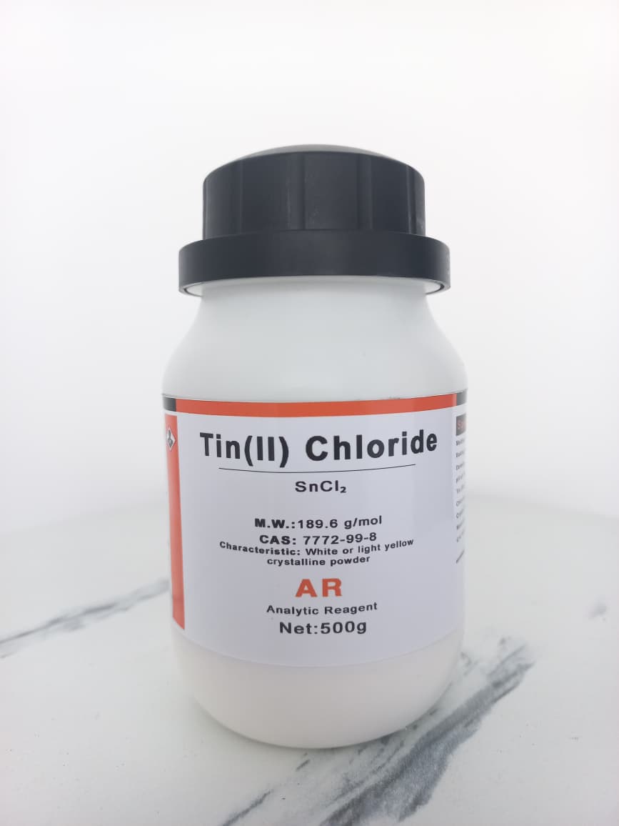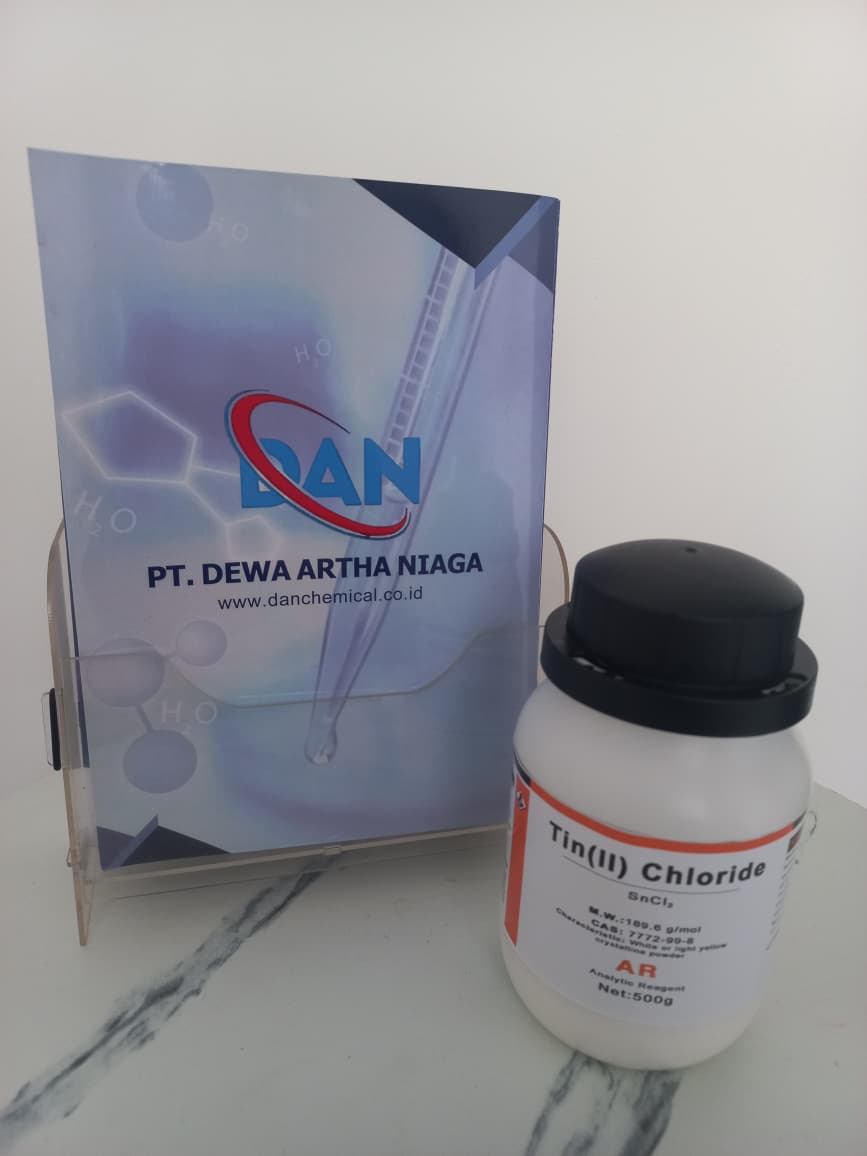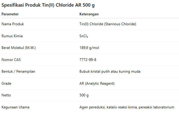 Tin(II) Chloride atau Stannous Chloride adalah senyawa anorganik yang memiliki rumus kimia SnCl₂. Senyawa ini berbentuk bubuk kristal putih hingga kuning muda dengan berat molekul 189,6 g/mol dan CAS Number 7772-99-8. Produk ini termasuk AR Grade (Analytic Reagent) sehingga memiliki kemurnian tinggi dan sangat sesuai untuk kebutuhan analisis laboratorium, penelitian, maupun aplikasi industri.
