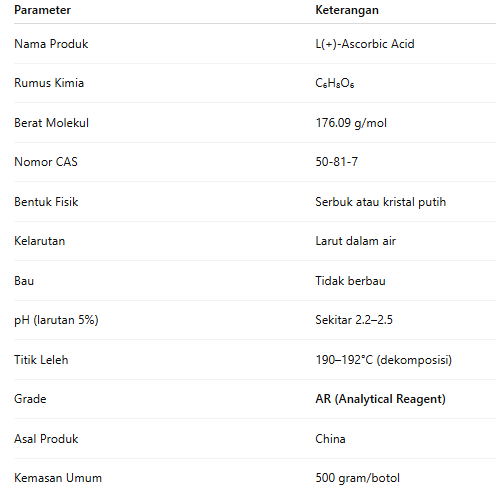 Secara kimia, L(+)-Ascorbic Acid memiliki rumus molekul C₆H₈O₆, dengan berat molekul 176.09 g/mol, dan nomor CAS 50-81-7. Bentuk fisiknya berupa serbuk putih kristalin atau kristal halus yang mudah larut dalam air namun tidak larut dalam pelarut organik nonpolar seperti eter atau kloroform.