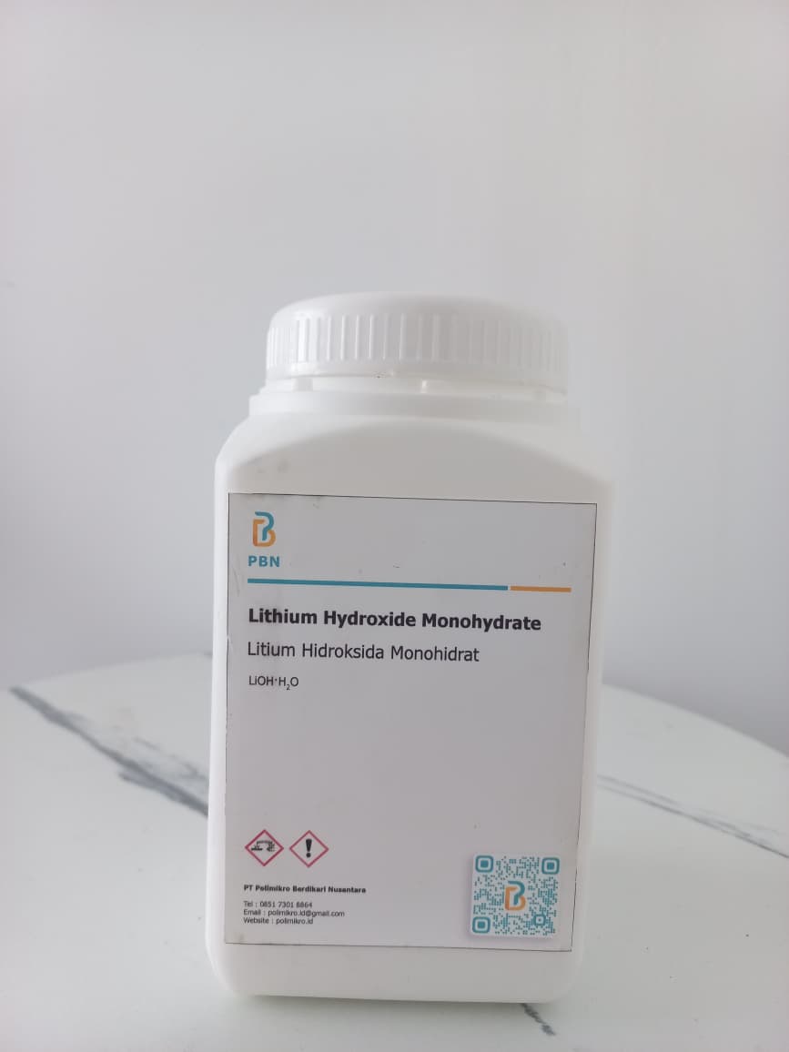 Lithium Hydroxide Monohydrate adalah senyawa anorganik dengan rumus kimia LiOH·H₂O. Ia tersedia dalam bentuk kristal putih dan sangat higroskopis, yang berarti senyawa ini mudah menyerap kelembapan dari udara. Produk ini biasanya digunakan dalam industri manufaktur baterai, terutama baterai lithium-ion yang digunakan dalam berbagai perangkat elektronik, kendaraan listrik, dan alat energi terbarukan. Lithium Hydroxide juga digunakan untuk mengolah gas CO₂ dalam sistem kehidupan tertutup, seperti pada pesawat ruang angkasa atau kapal selam.