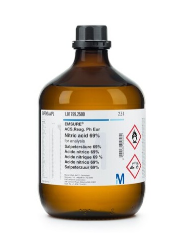 Nitric Acid 69% EMSURE® (Merck) adalah larutan asam nitrat bermutu tinggi yang diformulasikan khusus untuk keperluan analisis laboratorium dan pekerjaan penelitian. Produk ini bersifat AR (for analysis) sehingga cocok untuk titrasi volumetrik, preparasi sampel (mis. digesti asam untuk analisis logam), reaksi nitrasi terkendali, pembersihan peralatan laboratorium, serta penggunaan dalam metode instrumentasi seperti AAS, ICP-OES dan ICP-MS setelah dilusi sesuai prosedur. Larutan jernih (kadang sedikit kuning bila mulai terdegradasi/terpapar NO₂) ini memiliki kemurnian dan konsistensi batch yang didukung oleh sertifikat analisis (COA) dari Merck. Tersedia dalam pilihan kemasan laboratorium praktis: 1 L dan 2.5 L.