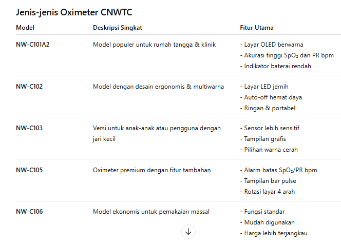 Oximeter CNWTC adalah solusi ideal untuk pemantauan saturasi oksigen dan denyut nadi yang cepat, akurat, dan praktis. Dengan beragam model seperti NW-C101A2, NW-C102, NW-C103, NW-C105, dan NW-C106, CNWTC menyediakan pilihan luas untuk kebutuhan rumah, klinik, hingga olahraga. Dukungan material berkualitas, fitur modern, serta harga kompetitif menjadikannya salah satu brand oximeter yang patut dipertimbangkan.