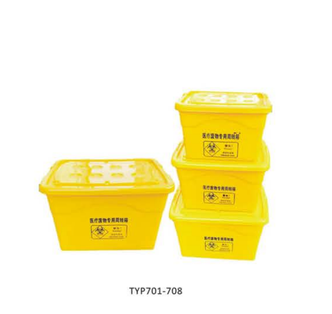 - TYP701–708: Wadah medis berbentuk kotak horizontal dengan tutup rapat untuk penyimpanan limbah padat berbahaya.